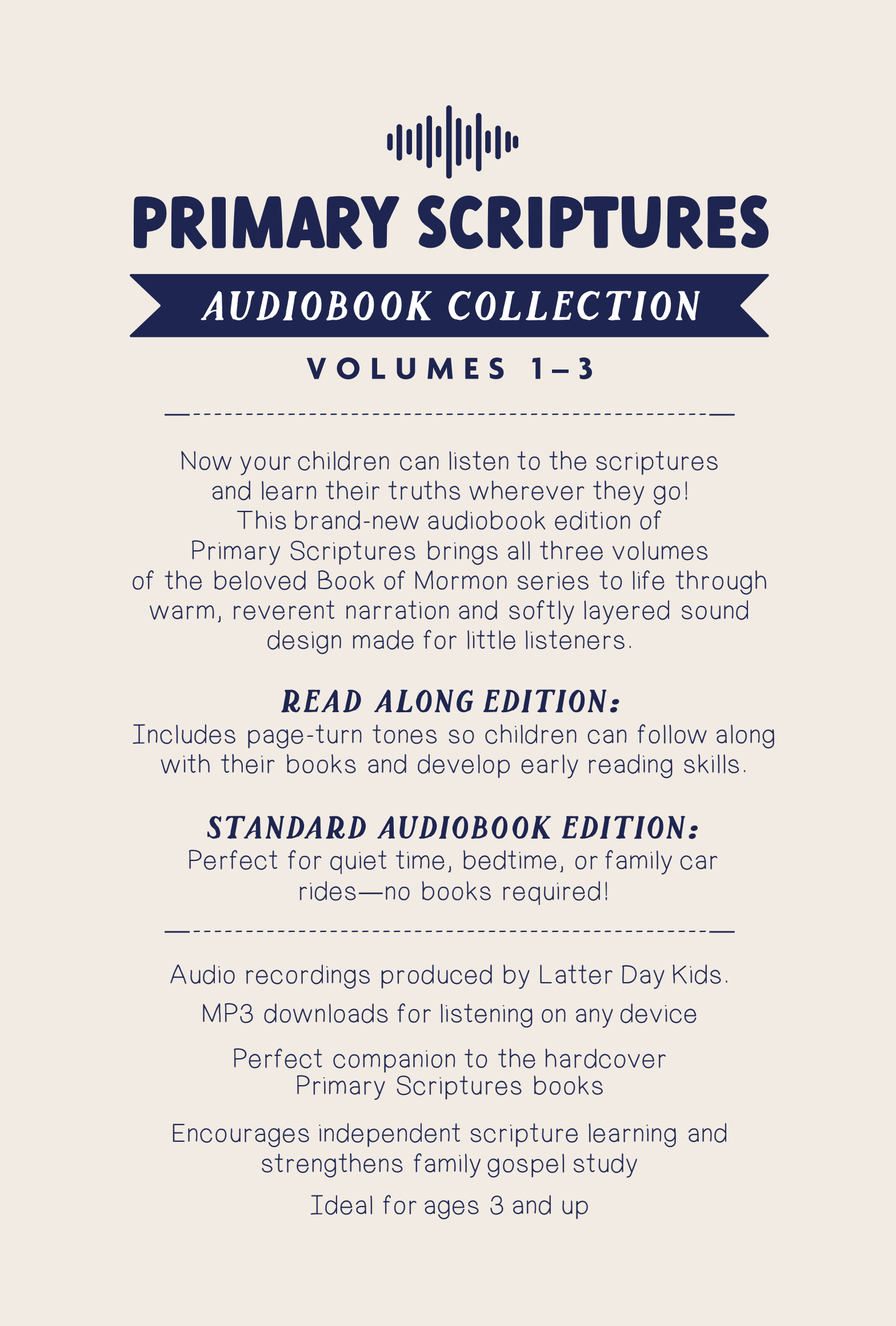 Now your children can listen to the scriptures and learn their truths wherever they go! This brand-new audiobook edition of Primary Scriptures brings all three volumes of the beloved Book of Mormon series to life through warm, reverent narration and softly layered sound design made for little listeners.